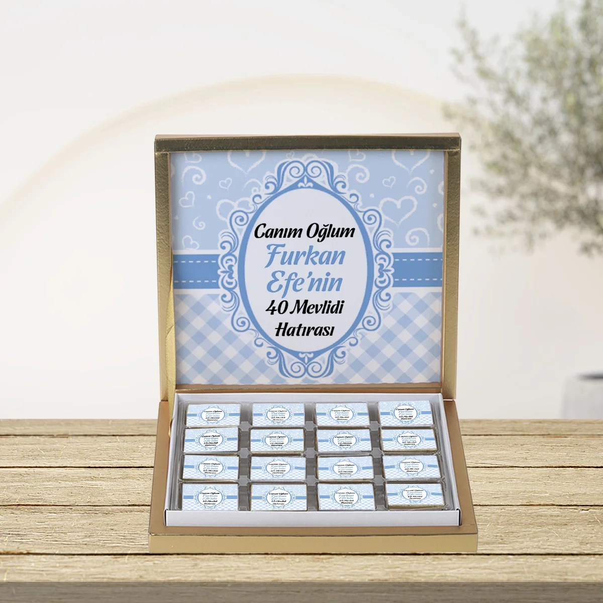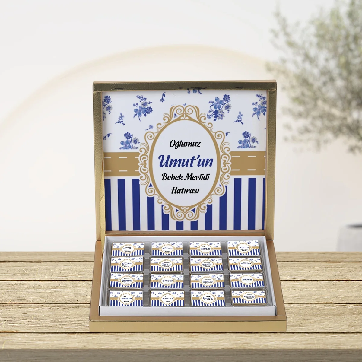 64 Sayfa Çiçek Mavi 48'li Gold Kutu Çikolata